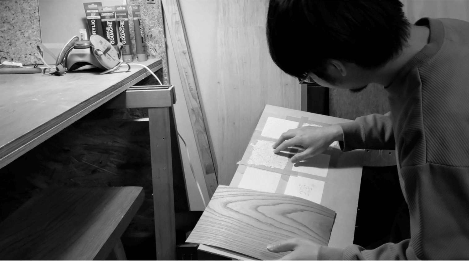 建築設計という長期的なプロジェクトとは別に、日々感じる内面をアートを通して表現したいという衝動にかられ、手を動かす。突板・経木を用いた独自の技法でアート作品を制作。
